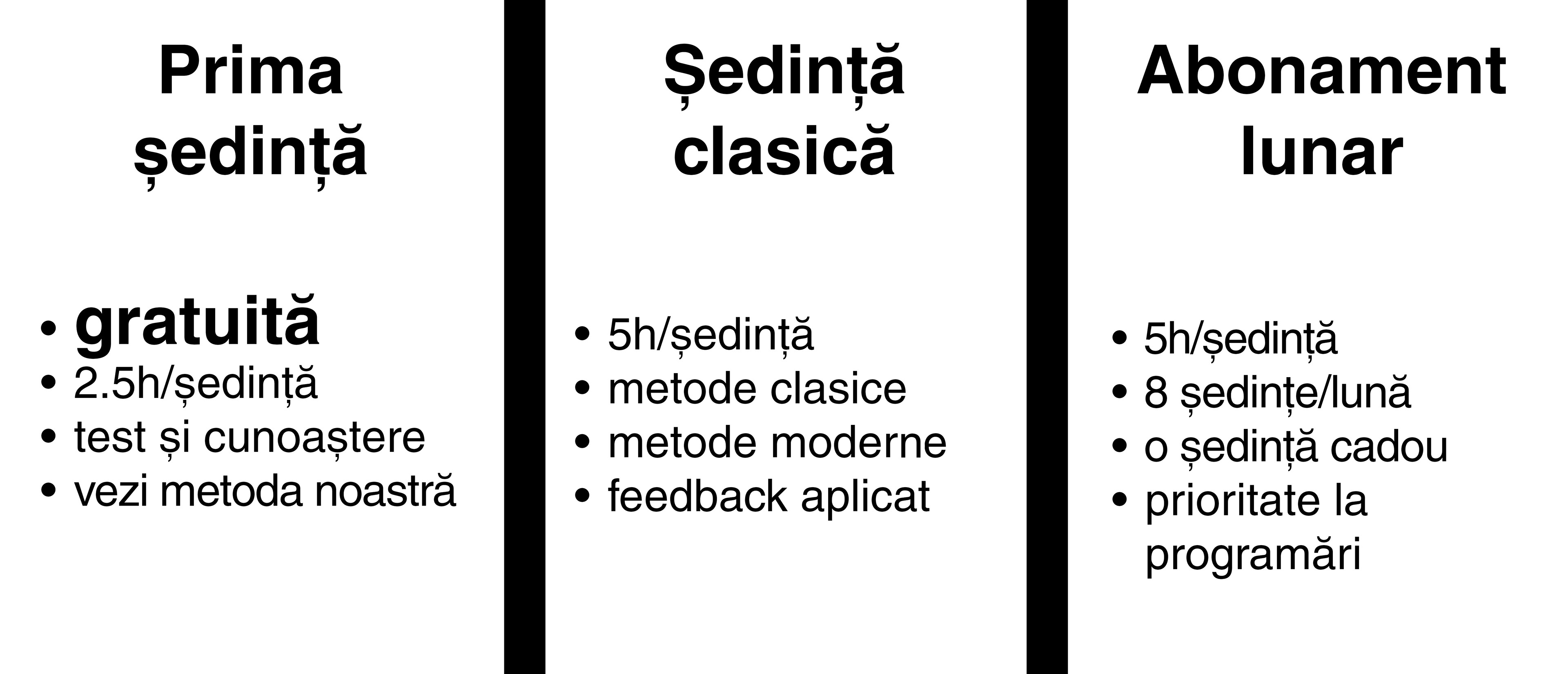 Două sesiuni/săptămână (una sâmbăta, una în timpul săptămânii).
